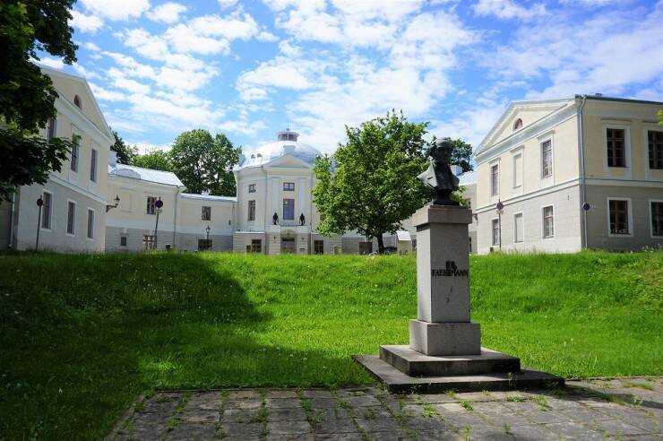 町の中心部にたたずむタルトゥ大学の本館は、1806年に建てられたギリシア式の円柱が並ぶ堂々たる建物。本館内にあるタルトゥ大学美術館や式典会場、懲罰室は一般の見学も可能です。