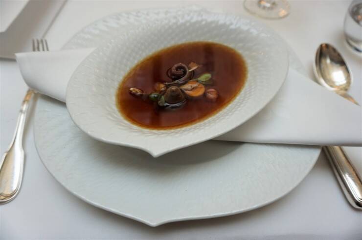 営業時間はディナータイムのみで、メニューはコース料理が基本ですが、6名までならアラカルトにも対応可。5品のコースは一人120ユーロ、7品のコースは150ユーロです。コースの内容は時期によって変わりますが、コースの一例をご紹介しましょう。