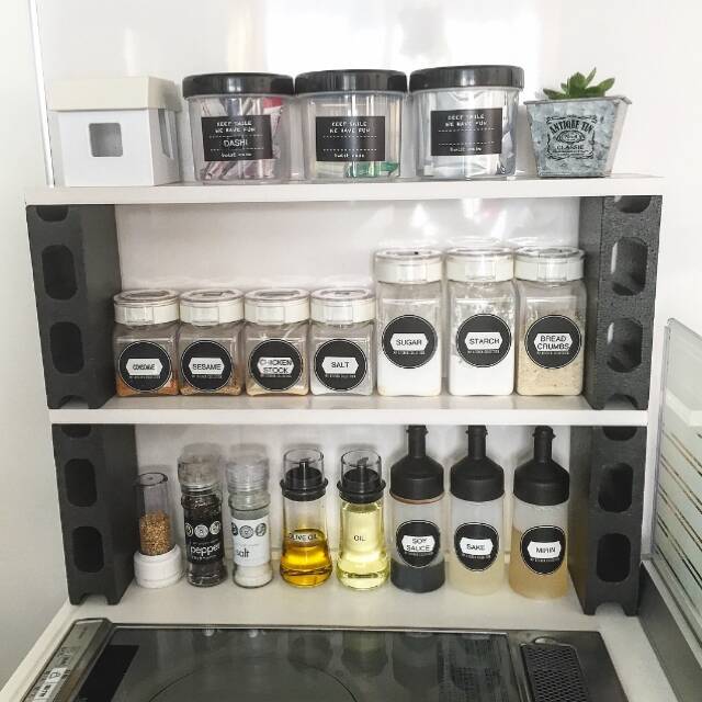 木材とコンクリート風発泡スチロールを、組み合わせて作られたスパイスラックです。使われているのは板と発泡スチロールのみで、こんなにもかっこいい仕上がりに。さえぎるものがない作りで、取り出しやすいですね。また、段ごとに容器にも統一感をもたせてすっきりした印象です。真似してみたいアイデアです。