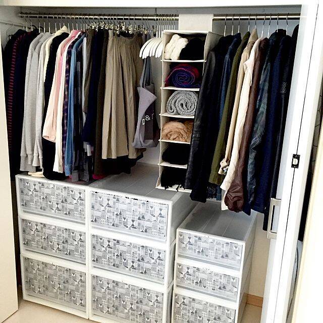 こちらのユーザーさんのように奥行きのある大きめの引出式ポリプロピレンケースを、深型と浅型の2つを上手に組み合わせることで、クローゼットが収納棚のようになってくれます。そうなるとスッキリとした清潔感のあるクローゼットになり、クローゼットの中をきっちりと分別することでシンプルな生活を送れます。