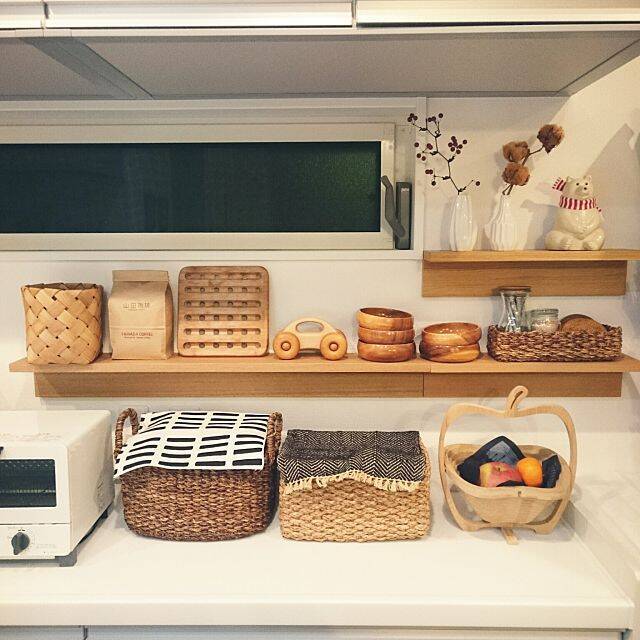 雑貨を飾ったり、普段よく使うものを収納したりと、万能に使えるのが「壁に付けられる家具」の棚シリーズ。こちらのユーザーさんは、キッチンの吊り戸棚と、カウンターの間の壁に。デッドスペースになりやすい所を上手に使われています。なかなか雑貨を飾る余裕がないキッチンでも、こんなほっこり空間が演出できるんです。