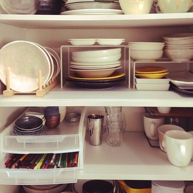 お皿を重ねて収納すると下の方のお皿が取り出しにくくなりますよね。無印のアクリル仕切り棚を使えば、高さのある棚の中に段を作ることができます。デットスペースになりがちな空間を活用して無駄なくお皿を収納できますよ。