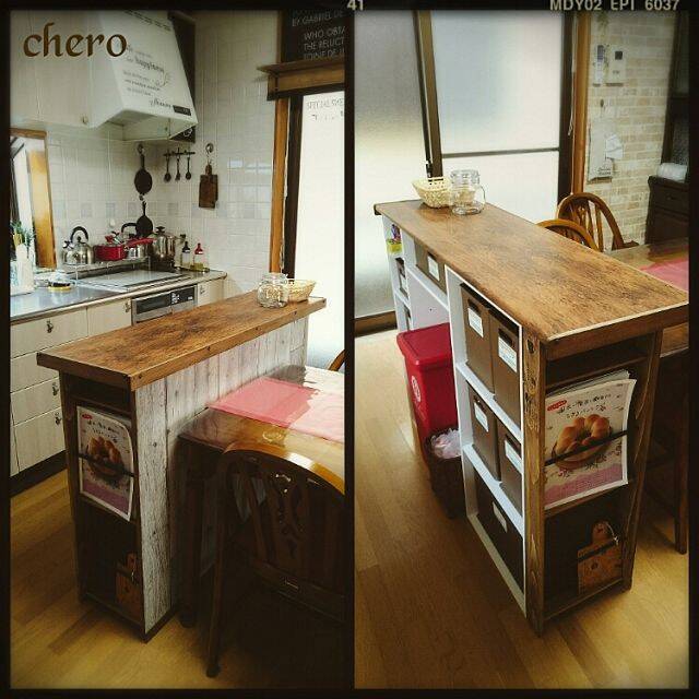 カラーボックスを2つ使うことで、収納力バッチリのカウンターを作ることができます。chero.さんがしているように、カッティングシートや木材で仕上げることで、オシャレな仕切りとしても活躍してくれます。