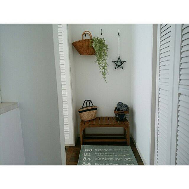 こちらのユーザーさんは、ガーデンベンチに真っ白なフェイクムートンをかけて、ナチュラルかつロマンティックな雰囲気になっています。下に収納しても隠せるのがいいですね。ニトリのバスケットとペーパーバッグの使い方も、参考にしたいディスプレイです。