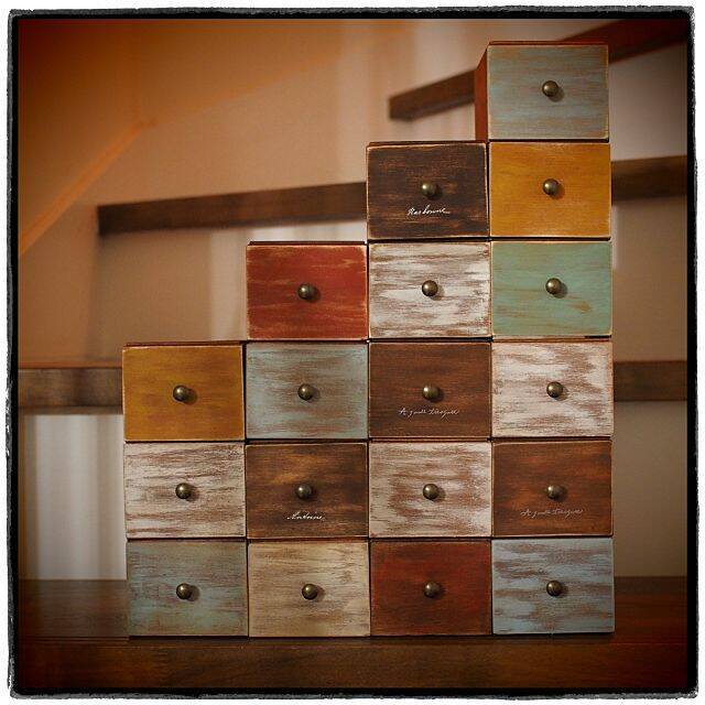 小さくて四角い箱型引き出し。並べて、積み上げてどんどん足していくととてもハイセンスなインテリア家具になります。