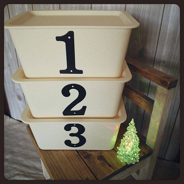 子どもたちが使うおもちゃや小物入れるなら、使いやすくてわかりやすいものがいちばん!ダイソーのフタ付きボックスに大きな番号のプレートをつけて、子どもたちでもわかりやすいように。使いやすいアイテムをさらに便利にする、ぜひ参考にしたいアイデアです。