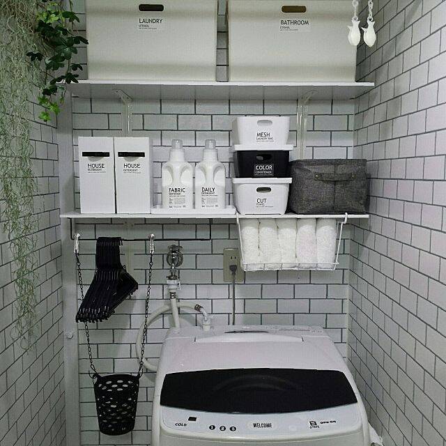 洗濯機の上は貴重な収納スペースです。ここに棚やラックがあることで、シンク下の収納に余裕も生まれます。こちらは洗濯機上に2段の棚をDIY。ラックよりも解放感があり、空間を上手く利用されています。吊戸棚下ラックにタオルを入れたり、アイアンバーを取り付けてハンガー置きにしたりと、アイデア満載の洗面所です。