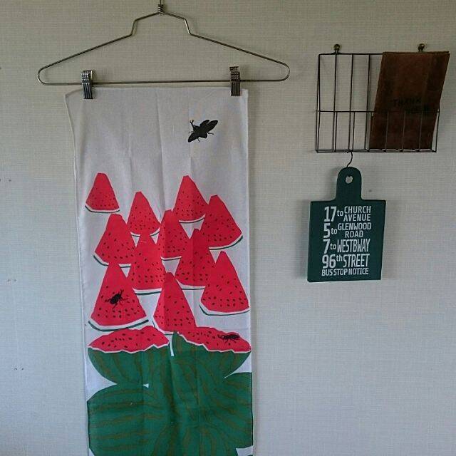 スイカとカブトムシが描かれた夏らしい手ぬぐいを、ハンガーのピンチにはさんで壁に飾っています。塩系な雑貨に、インパクトのある柄を合わせることで、ぱっと目を引くコーナーになっていますね。ピンチで挟んでいるだけなので、季節ごとに取り換えるのもとても気軽に行えそうです!