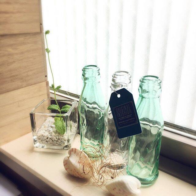 窓辺にグラス瓶を飾ると、自然光がグラスにあたり、キラキラしてきれいに見えます。透明のグラスの他に、ブルー系のグラスも飾るとよりいっそう透明感が出ます。こちらのユーザーさんは、貝殻を一緒にディスプレイすることで海の雰囲気を出しています。ブルーのグラスとの相性も良いですよね。
