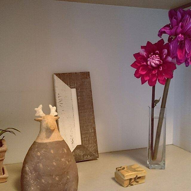 骨董品のようなアンティークなインテリア雑貨と、お花を玄関に飾っている実例です。生花と掛け合わせるだけで、洗練された印象になりますね。重要なのは、お花をはっきりとした明るい色味のものにすること。そうすることで、古くなりすぎず、スタイリッシュにきまります。