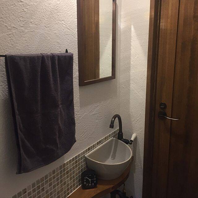 トイレの手洗いの上に取り付けた、無印良品のミラー。ちょっとした身だしなみチェックにぴったりの場所ですね。シンプルな木枠のミラーが、落ち着いた雰囲気にあっていいて、タイルが印象的なインテリアが引き立ちます。