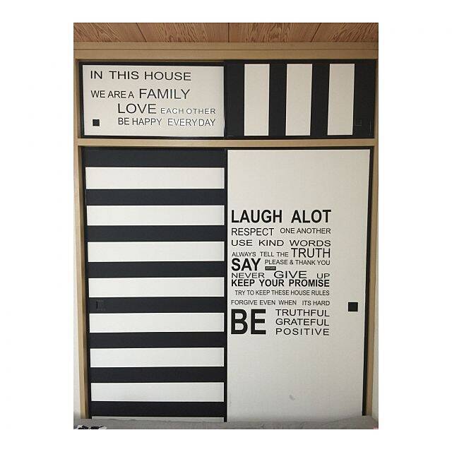 モノトーンのストライプに、英字のウォールステッカーが目を引く扉は、ユーザーさんがマスキングテープを貼って作られた扉です。和風なふすまに、マスキングテープとウォールステッカーをプラスするだけで、お部屋の雰囲気をガラリと変えることができますね。和の雰囲気を感じさせない扉に仕上がっています。