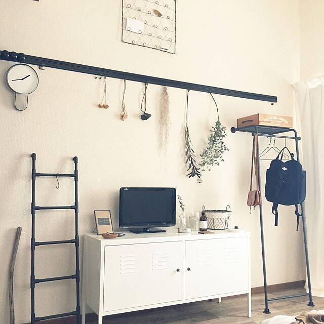 アンティーク感を取り入れた、塩系インテリアのお部屋のユーザーさんです。生活感のあるものはキャビネットに隠しているので、インテリアに統一感がありますね。キャビネットとドライフラワーなどの雑貨を上手に組み合わせて、海外インテリアのような雰囲気のあるお部屋になっています。