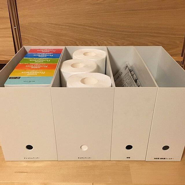 キッチンの近くの押し入れを、パントリーとして使っているというユーザーさん。パントリーの棚に消耗品を収納するのに、無印良品のファイルボックスを使われています。A4のファイルボックスは、新聞やティッシュボックスを入れるのにもちょうどいい大きさですね。