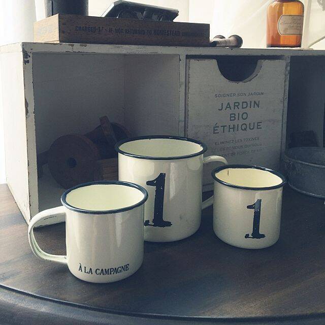 ホーロー用鉄板にホーロー加工された、インテリアカップです。ユーザーさんの実例写真でよくお見かけする、ナンバーマグにそっくりな形です。使いこまれたような味のあるデザインが、インテリアのポイントになりますよ。kikkoさんのシャビー感のあるインテリアによくマッチしています。