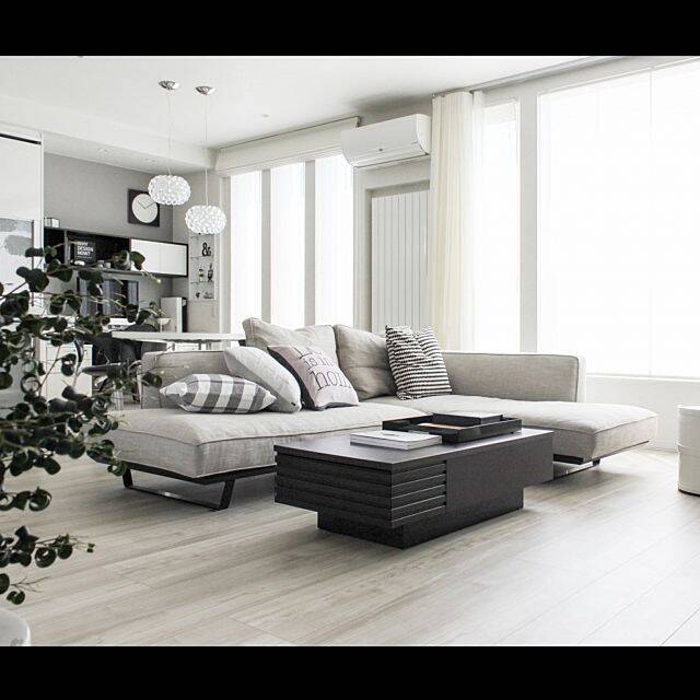北海道でご夫婦とワンコで暮らすsh.atyouさん宅は、モダンな外観の平屋1LDKです。玄関を入った最初の扉の先には、海外のインテリア雑誌から飛び出したような、モノトーンで統一されたモダンなLDKが広がっていました。ハイトーンの白やグレイを中心にまとめられたモノトーンはどこか優しく、暮らしの温かみも感じさせてくます。ゆったりとしたローソファや、重なり合うクッションの色合いのニュアンス、大きな窓から入る光、ファニチャーと雑貨と家が相乗し合いながら開放感を演出しているのも魅力的です。