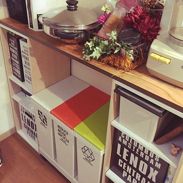 スリムタイプのボックスを2つ使って、キッチンカウンターとゴミ箱収納を同時に叶えている実例です。それぞれの棚にはファイルボックスや同柄のボックスを使って収納スペースにし、モノトーンで色味を抑えているのでカラフルなゴミ箱ともなじんでいます。