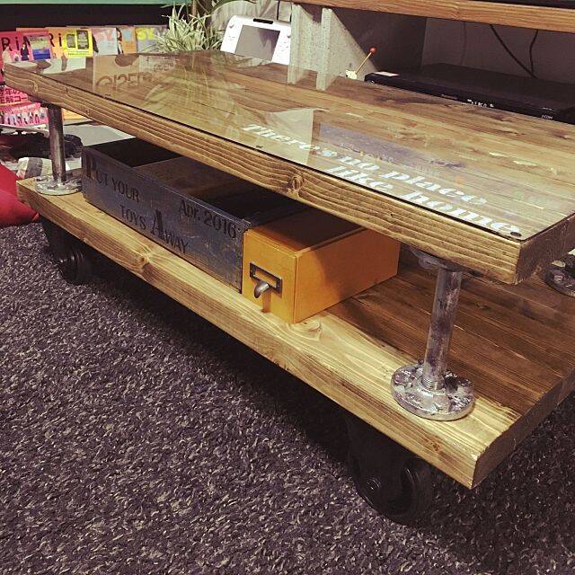 こちらは、中ほどに棚部分が作られているローテーブルです。棚部分となる空間があることで、重たい印象になることもありません。さらに棚部分をつなぐ材料には、ガス管をチョイス。驚きのアイデアですが、センスを感じるローテーブルに仕上がっていますね。インダストリアルな空間作りにも、ひと役かっています。