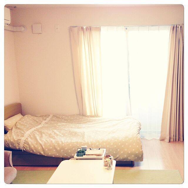 こちらのユーザーさんは、お部屋の手前にベッドを置いています。リビングスペースが窓際になるので、自然光が入って明るいリビングになりますね。ベッドのまわりにレースカーテンを付けて、目隠しにしているところもポイントです。