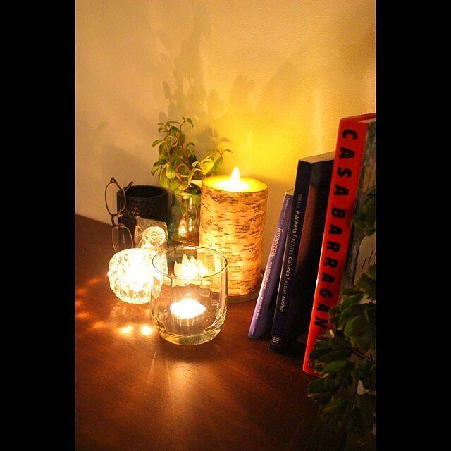 hanaさんがもっているキャンドルは、LUMINARA LEDキャンドル ボタニカルバーチウッドです。他のキャンドルとともに使っていますが、こちらのキャンドルは、LEDキャンドルなので、スイッチをONすれば使えますし、小さなお子さんがいても安心です。立てかけた本にも光があたって幻想的ですね。