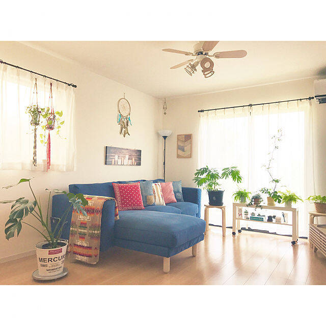 ボヘミアンと西海岸スタイルがミックスされた爽やかなお部屋の中、ポイントとなっているのが、ソファーの上に並べられたクッションと、かけられたブランケット。カラフルではありますが、どれも落ち着いた、それでいてあたたかみのあるカラーのファブリックが、居心地の良さを感じさせてくれます。