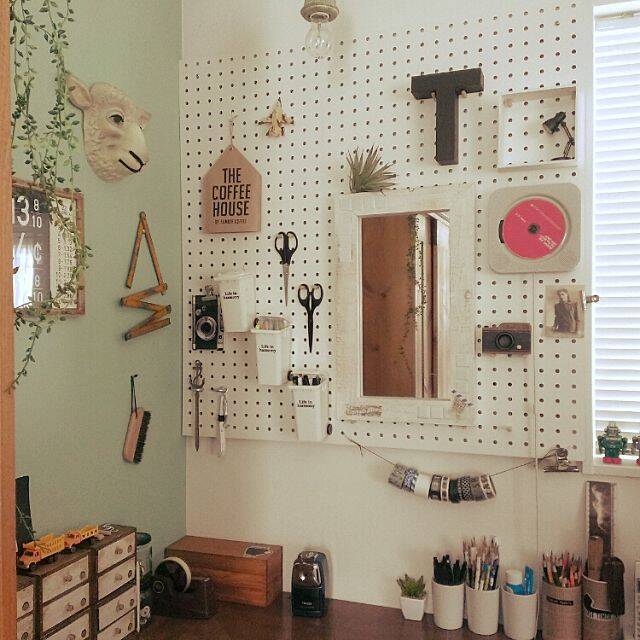 デスク前の壁に有孔ボードを貼って、よく使う文房具を収納しているMisatoさん。ミラーや雑貨も一緒にバランス良く飾られた、見せる収納ですね。壁掛式CDプレーヤーの位置も絶妙なアクセントになっています。