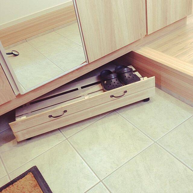 靴箱収納下の隙間にぴったり合わせて作られた、靴の収納棚。すのこなので風通しもよく、靴の収納にももってこいです。靴箱にしまいきれないものを収納できたり、急な来客時などにもいろいろ使えそうです。キャスター付きなのでお掃除もしやすいですね。