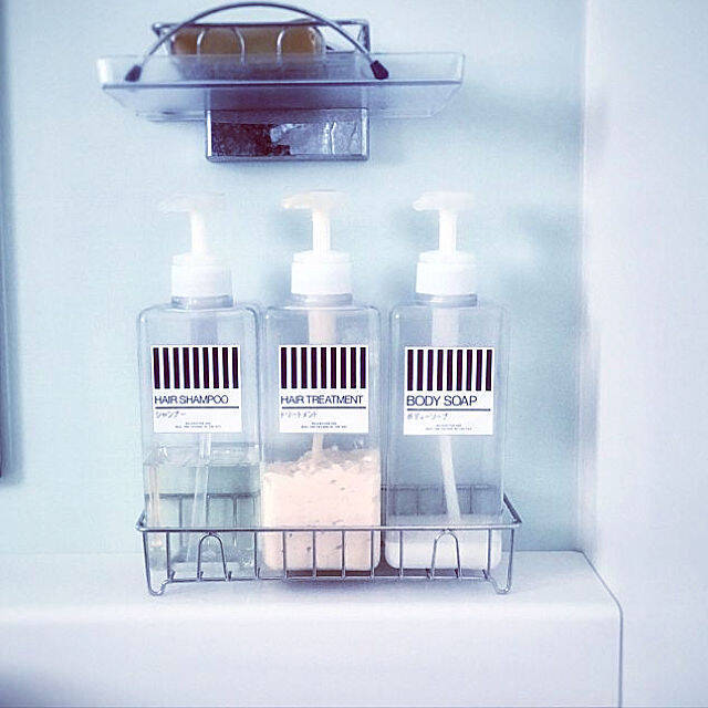 市販のボトルでは、サイズやボトルの色が異なることが多くあります。同じボトルに詰め替えることで、同サイズでスッキリした雰囲気になりますし、ボトルの色もそろって統一感が生まれます。こちらのユーザーさんは、シャンプーなどを詰め替えて使っていらっしゃいますが、サイズがそろってきれいに見えますね。