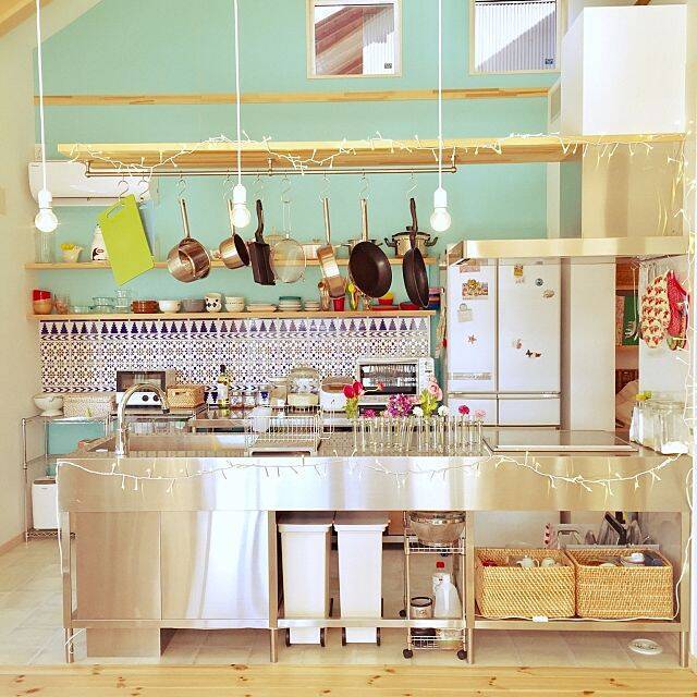 同系色なら色と柄でも馴染みやすそうです。double-doubleさんは、青のキッチンに合わせてタイルステッカーを。涼しげでとっても華やかな印象です。吊るされた照明やシャンデリア、グリーンなど、さまざまなジャンルのものが視界に入り退屈しませんね。風で揺れたり、向きが変わるさまもまた楽しそうです。