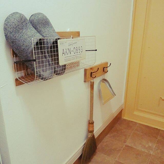 スノコと焼き網でスリッパ入れを作った、こちらのユーザーさん。ダイソーのナンバープレートをワンポイントに付けて、ナチュラルテイストな雑貨に仕上げています。ホウキやチリトリと並べて、さりげないかわいらしさのある玄関になっています。