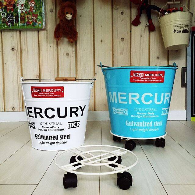 かっこいいロゴも魅力のバケツは、マーキュリーのもの。こちらの実例では、ダイソーのキャスター台と組み合わせていらっしゃいます。お子さんたちのおもちゃ入れとして利用されているバケツ。出しっぱなしにしていても絵になるデザインです。