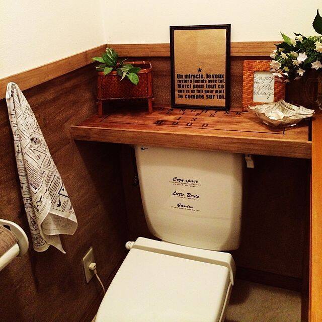 トイレタンクをすべてカバーするのは、かなりの手間と時間のかかるDIYです。そこで、まずはタンクに板材を載せるだけというアイデアをご紹介しましょう。タンクの上が飾り棚になるので、これだけでも見違えた雰囲気になります。