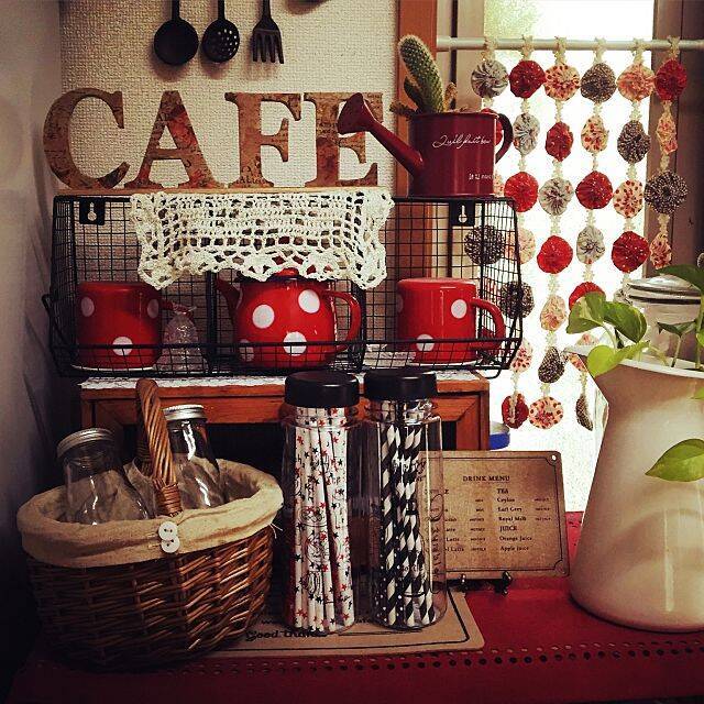 赤がメインカラーのポップでキュートなカフェコーナー。このカフェコーナーの中央に、セリアのウォーターボトルの姿が確認できます。中に詰めているのは、ドリンクではなくペーパーストローとのこと。収納に困るストローも、ウォーターボトルがあれば、こんなにスマートに整理できるのですね。さっそく実践したくなります。