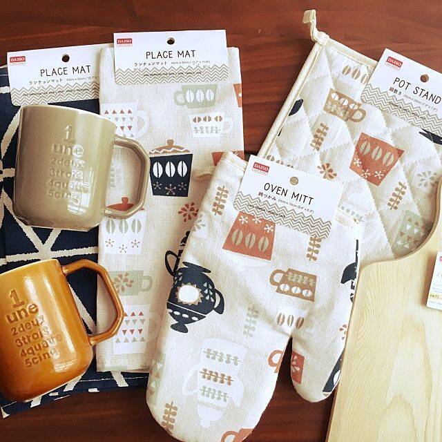 ダイソーでは、デザインがよくて、インテリアとして楽しめる鍋つかみが見つかります。同じ柄のファブリックで、ランチョンマット、ポットマットなどとそろうシリーズもあります。優しい色合いに、ティーポットやカップ柄のシリーズは、カフェっぽいデザインがおしゃれです。同じ柄でそろえると統一感がありますね。