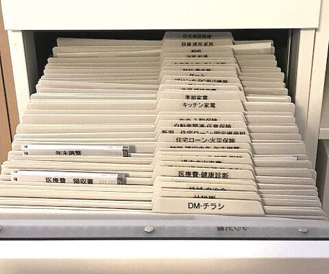 「以前は低価格の紙製の個別フォルダを使っていましたが、5年でボロボロに。おうちの書類は暮らしとともに項目が変化するので、シールの貼り直しもできるPP製に変更しました。PP製は耐久性も抜群で、永く使える書類収納となりました。」