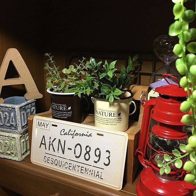 少し男前なテイストのakekuroankoさんのディスプレイ。正面にダイソーのナンバープレートがあると、空間がフワッと華やぎます。アンティーク感のあるデザインなので、一気におしゃれ度が増します。赤いランタンとも相性がよく、グリーンがとても映えますね。