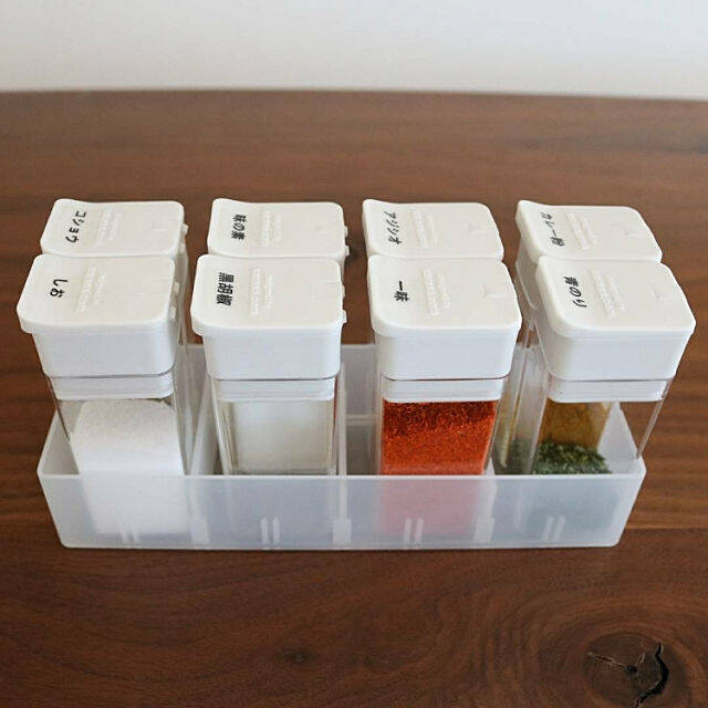 411.kaoriiiiさんの愛用品は四角いスパイスボトル。丸いデザインのものが多いですが、四角だとデッドスペースができずにすっきりと収まります。また、ふたの裏側にでっぱりがあるので、粉類がついて穴がふさがるのを防いでくれるそう。とても考えられていますね。