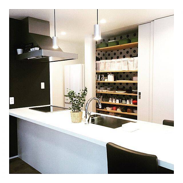モノトーンで広々とした、SIMPLEさんのキッチンです。背面には背の高い収納棚があり、食器類が使いやすい配置で並んでいます。使わないときは扉を閉じて視線をシャットアウトできますし、なにより、ものが一つも出ていない作業スペースの清潔感が際立ちます。