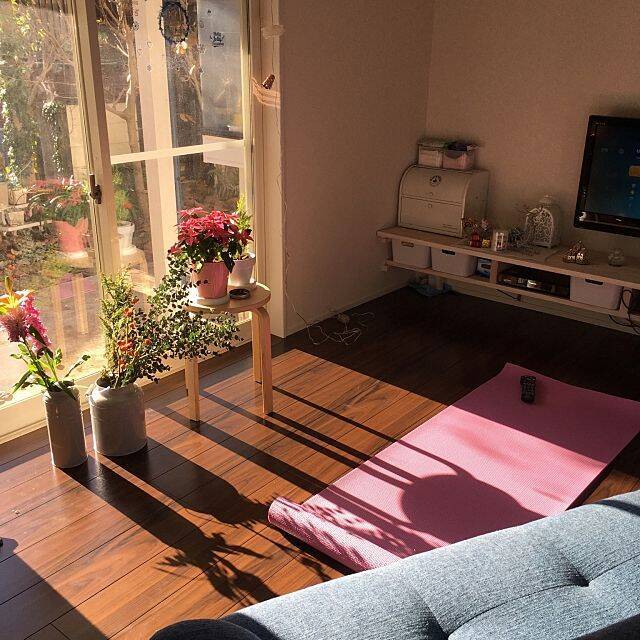 momoさんのリビングは、自宅をヨガ教室に開放しています。午前中などリビングに光が入る時間帯に行うと、体も目が覚めてきそうです。共通の趣味のお友達と一緒に、目標に向かって頑張ることで、自分のモチベーションも上がりますよね。