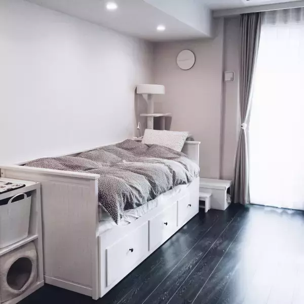 aronekoさんのお部屋のレイアウトは、壁に沿ってベッドを配置し、その向かいの壁にTVを置いています。ソファは置かずに、くつろぎと睡眠エリアを融合させることで、広々とした空間のもとリラックスした時間を過ごすことができますね。部屋のこだわりは、「愛猫も快適に暮らせる部屋づくり」と「シンプルなホワイトインテリア」。猫も遊べる階段型のラックや猫アパートなど、愛情のこもった工夫がみられました。それらは、部屋のくつろぎスペースを囲むように置かれています。くつろいでいるaronekoさんに猫が寄り添い、互いに癒しの時間を過ごす風景が浮かんでくるようです。また、物が少なく、ミニマルなホワイトインテリアもaronekoさんのお部屋の特徴。清潔感を保ちたい、洗面所やキッチンの収納方法も参考になりました。好みのインテリアと愛猫との快適な暮らし、両方を実現されているaronekoさん。自分にとって必要なもの、大切なものの見極めができているからこそ、叶えられるインテリア&ライフスタイルだと感じました。これから改善予定の収納エリア、お披露目の日が今から楽しみです。