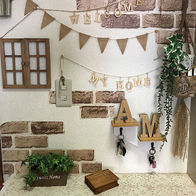 布製のガーランドと、他の小物の色を合わせてナチュラルテイストのコーディネートをされています。イニシャルの下に鍵を掛けるアイディアも参考になりますね。このような空間が部屋の一角にあると、帰宅したときに癒されそうです。
