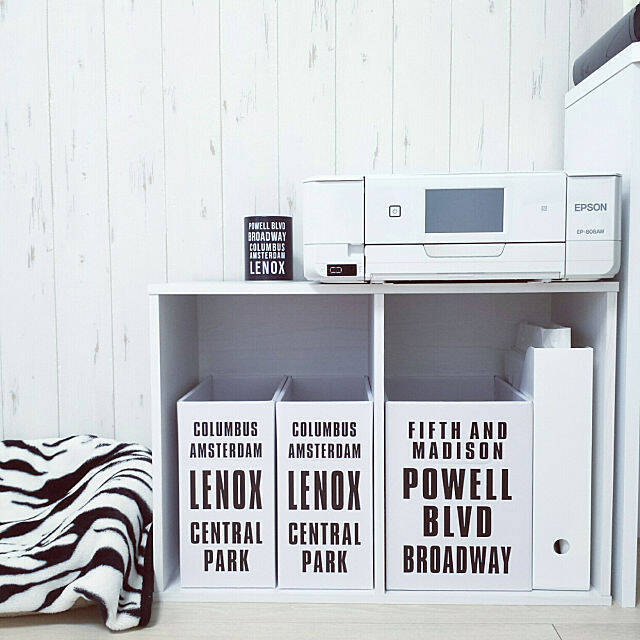 ホワイトのカラーリングが多いPC周辺機器は、モノトーンでまとめた収納棚に飾るのがおすすめです。モノトーンのロゴ入りペーパーボックスなら、シャープな印象のホワイトのプリンターともマッチしてくれます。どんどん増えてしまうPC周りの小物もスッキリと収納できますね。