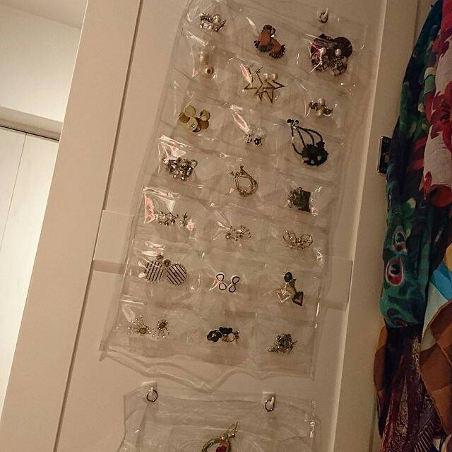 セリアのクリアタイプのウォールポケットを、クローゼットの扉裏に取り付けて、専用収納に。1組ずつがぴったり入る、ジャストなサイズです。手軽な保管方法なうえ、全体が一目で見えるので、選ぶ時間も短縮されそうですね。埃も付かず、大切なアクセサリーが汚れる心配もありません。