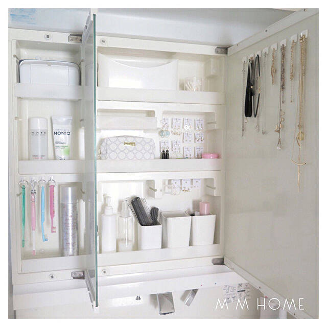 洗面スペースで、アクセサリーの取り外しを行う方は必見です。洗面台の鏡裏にフックを使って、便利な収納場所を作っていました。ピアスやネックレスがからまないように、適度な距離を取った配置に。普段は使わない側面を上手く活用しているので、特別なスペースを確保せずにできる素敵なアイデアです。