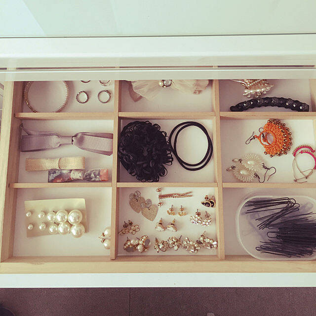 ドレッサーの引き出しを開けると、仕切りを使って美しく並べられたmarikaさんの収納。1つ1つが干渉しあわないように、空間に余裕を持って収められています。引き出しの中でも、整理整頓をしっかり意識されていて、アクセサリーへの愛情を感じます。
