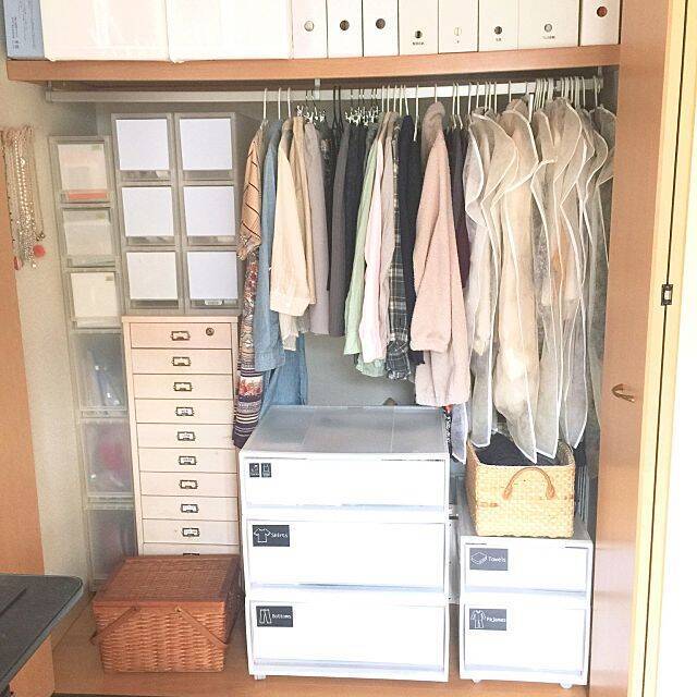 クローゼット全体の収納を工夫しているcocoさん。服の下に小物などの収納を配置し、下段にはニトリのファイルケースで家族用の小物の置き場所を確保していますね。
