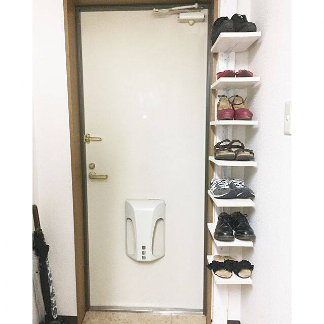 すのこの扉が付いた、通気性の良さそうな下駄箱。なんとこの下駄箱も、ディアウォールで作ったウォールシェルフなのだそうです。扉付きというのが実用的ですね!人目を遮ることができるので、お手入れ前の汚れた靴も安心して収納できちゃいます。