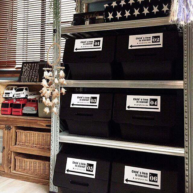 山善の蓋付き収納ボックスを愛用中のranranさん。男前なイメージのブラックを使用されています。ステッカーを貼るだけでもイメージが変わったり、オリジナル感がアップしたりします。忙しくて時間をかけられない!という方にもおすすめのアイデアです。