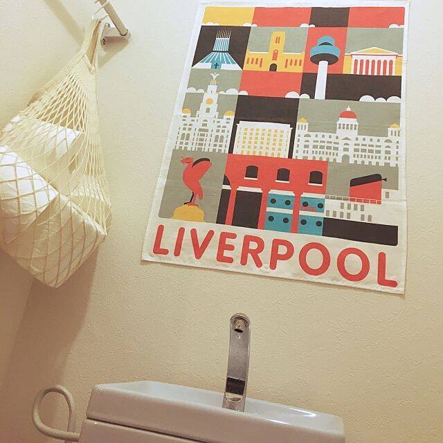 ミッドセンチュリー感のある色使いが印象的なティータオルを、壁に飾っているこちらのユーザーさん。そのままシンプルに飾ったことで、柄がより強調されていますね。トイレットペーパーの収納の仕方など、インテリアにこなれ感が出ていておしゃれです。