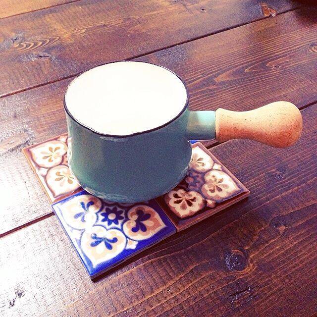 モロッコ調のタイルを鍋敷きとして使っている実例です。レトロ感があって、上に載せているダンスクの鍋とも相性が◎。使っていないときでもキッチンのアクセントとして活躍してくれますよ。どんな柄にしようか選ぶのも楽しいですね。